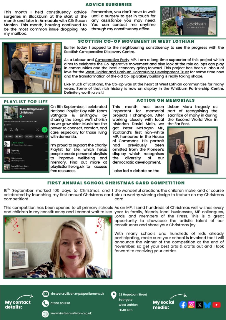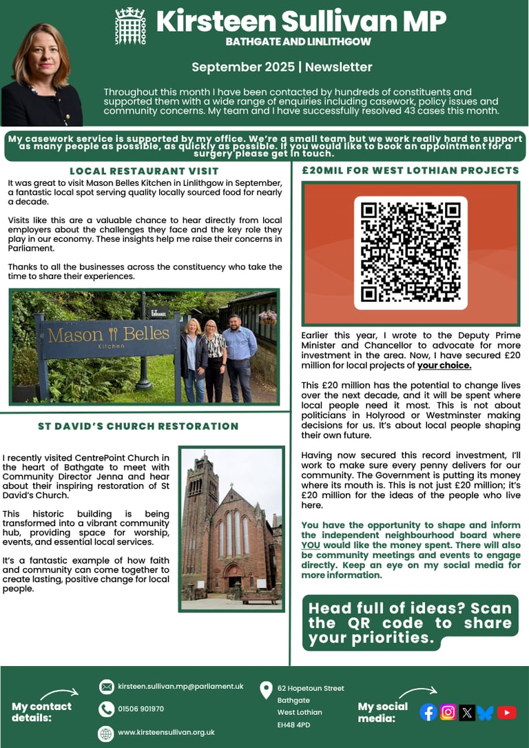 Kirsteen Sullivan was elected as the Member of Parliament for Bathgate and Linlithgow in July 2024, with a clear mission to put the local back into national politics. Kirsteen focuses on issues that matter most to the community—supporting local businesses, improving public services, and driving investment in the constituency.